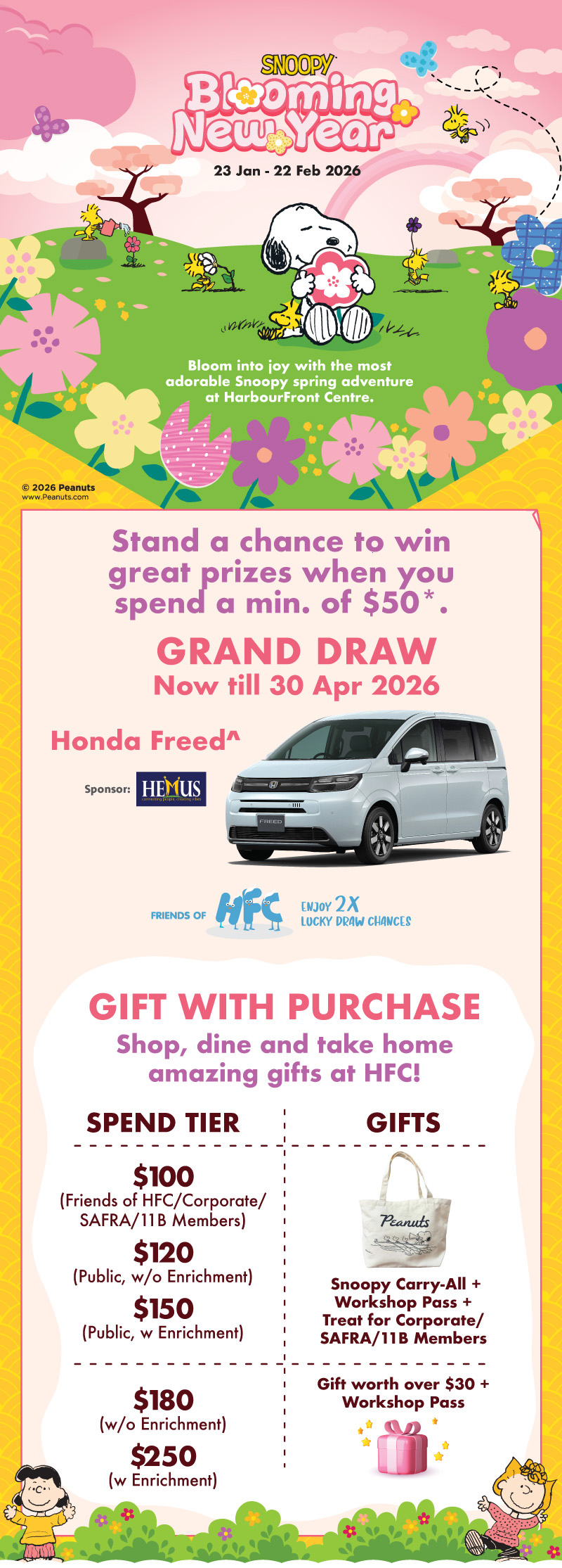 - Max. of 2 same-day receipts. Receive 1 lucky draw chance with every $50 spent. The public is entitled to a max. of 4 chances daily. Friends of HFC are entitled to a max. of 8 chances daily. Please view full T&Cs here.
