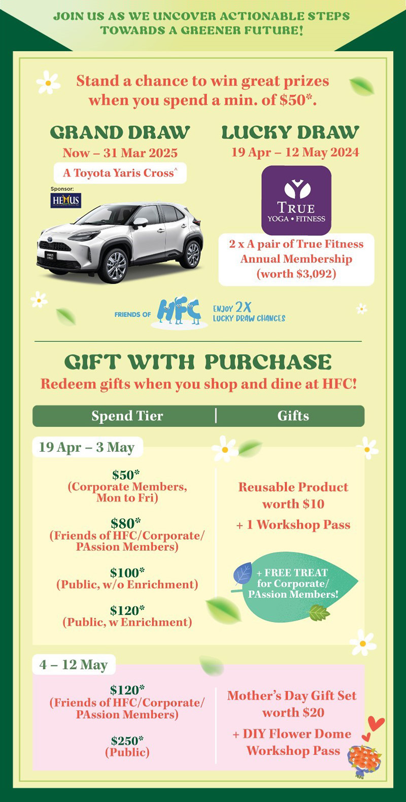 *Max. of 2 same-day receipts. Receive 1 lucky draw chance with every $50 spent. The public is entitled to a max. of 4 chances daily. Friends of HFC are entitled to a max. of 8 chances daily. Please view full T&Cs here.
